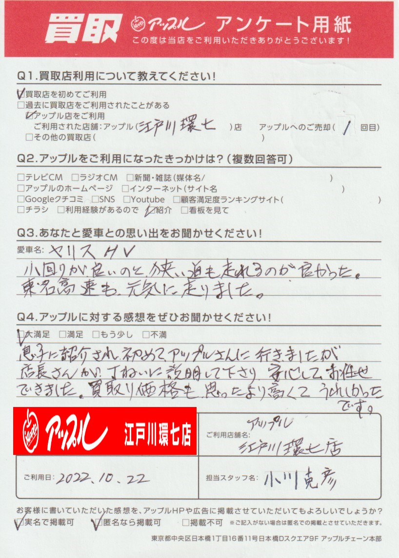 M様 車名:トヨタ ヤリス