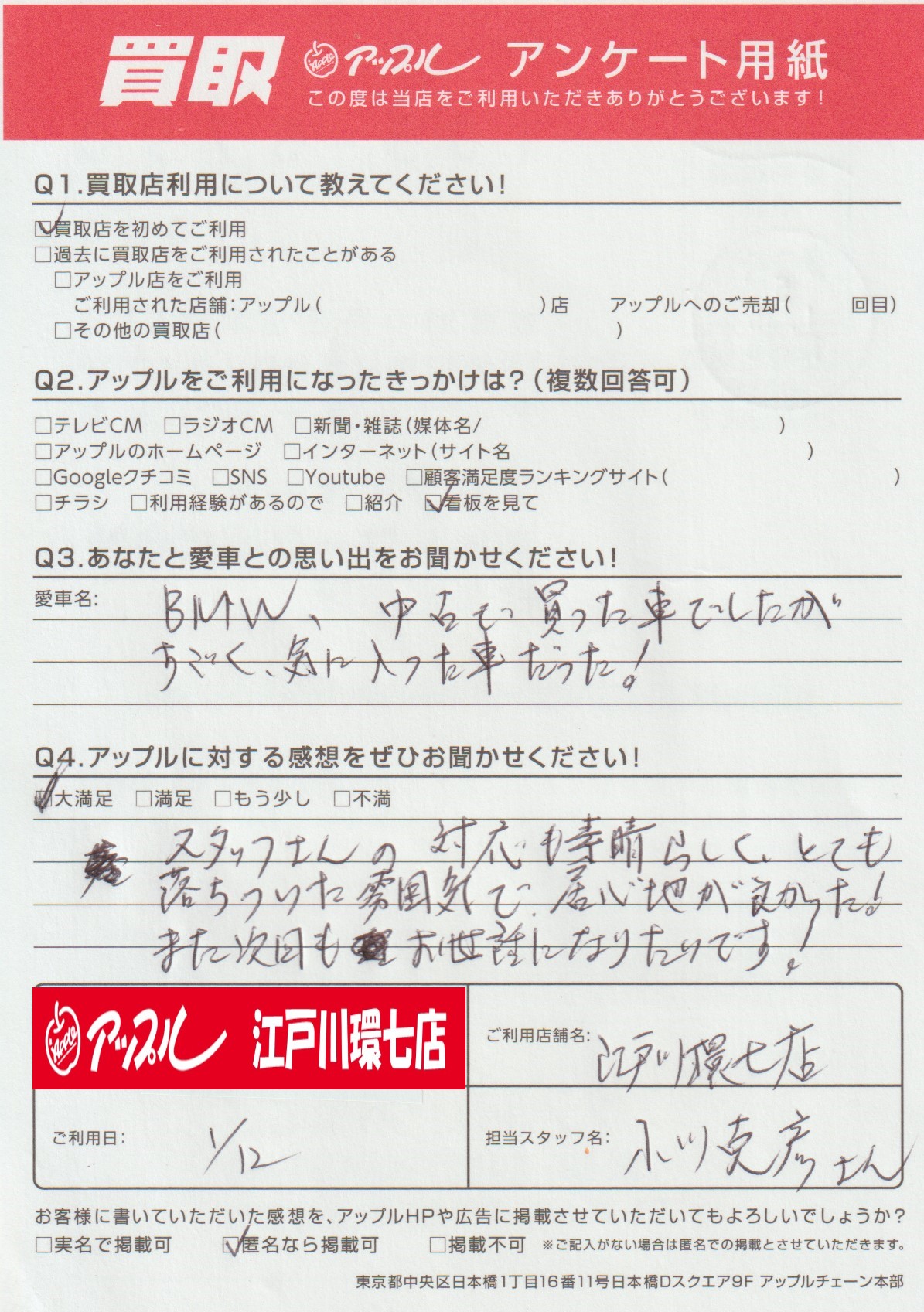 お車のご相談・ 査定だけでもOK! カンタン 入力 30秒 アップルがブランド買取始めました! お電話でも受付中! 受付時間10:00 ~ 19:00(最終査定受付時間は18:00です) 03-5658-0393 お車のご相談・ 査定だけでもOK! カンタン 入力 30秒 アップルがブランド買取始めました! お電話でも受付中! 受付時間10:00 ~ 19:00(最終査定受付時間は18:00です) 03-5658-0393 アップルがブランド買取始めました! お電話でも受付中! 受付時間10:00 ~ 19:00(最終査定受付時間は18:00です) 03-5658-0393 店舗情報 在庫車 スタッフ紹介 ブログ お客様の声 キャンペーン お得 無料査定 click お客様の声 ご記入日: 2023/01/12 A様 車名:BMW Q:あなたと愛車との思い出をお聞かせください!A:BMW 中古で買った車でしたがすごく気に入った車だった!Q:アップルに対する感想をぜひお聞かせください!A:スタッフさんの対応も素晴らしく、とても落ち着いた雰囲気で居心地が良かった!また次回もお世話になりたいです! 前へ 次へ お客様の声一覧を見る