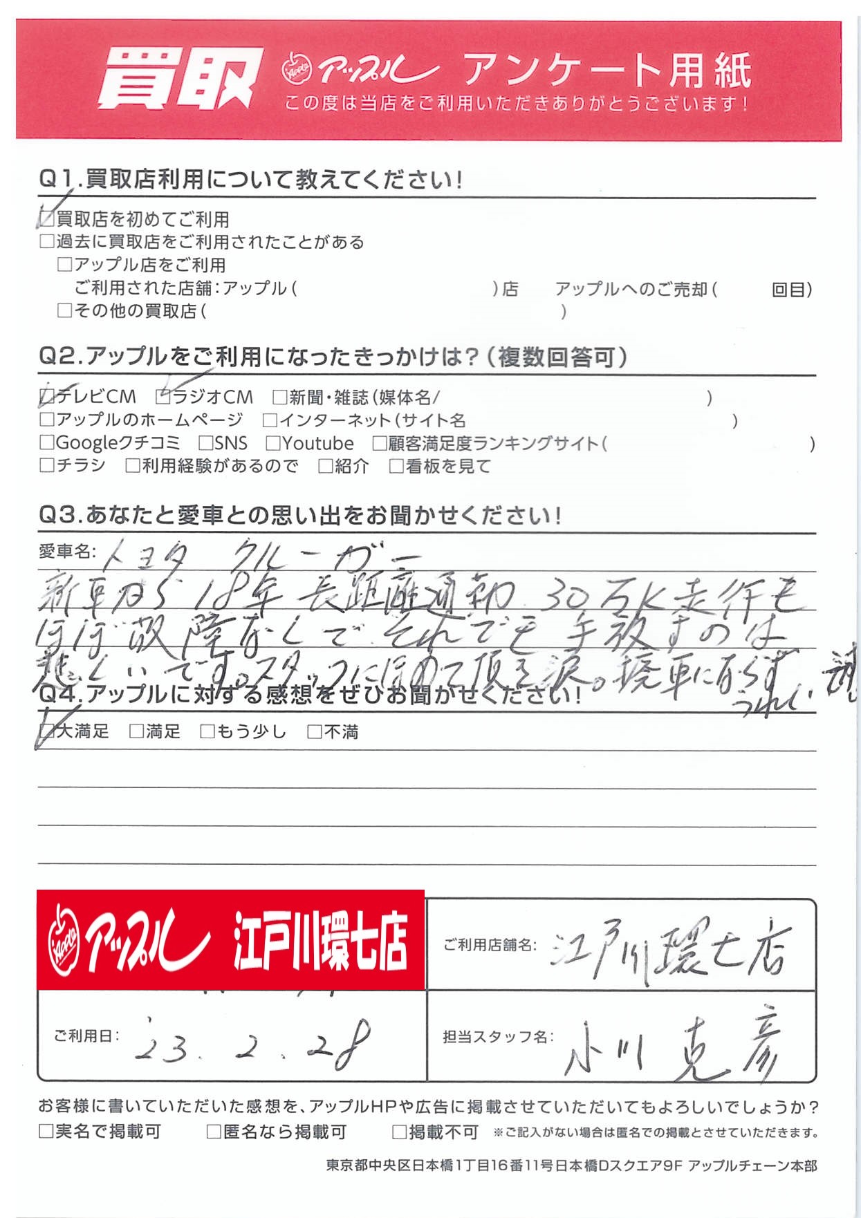 お車のご相談・ 査定だけでもOK! カンタン 入力 30秒 アップルがブランド買取始めました! お電話でも受付中! 受付時間10:00 ~ 19:00(最終査定受付時間は18:00です) 03-5658-0393 お車のご相談・ 査定だけでもOK! カンタン 入力 30秒 アップルがブランド買取始めました! お電話でも受付中! 受付時間10:00 ~ 19:00(最終査定受付時間は18:00です) 03-5658-0393 アップルがブランド買取始めました! お電話でも受付中! 受付時間10:00 ~ 19:00(最終査定受付時間は18:00です) 03-5658-0393 店舗情報 在庫車 スタッフ紹介 ブログ お客様の声 キャンペーン お得 無料査定 click お客様の声 ご記入日: 2023/02/28 S様 車名:トヨタ クルーガー Q:あなたと愛車との思い出をお聞かせください!A:新車から18年長距離通勤 30万キロ走行もほぼ故障無しでそれでも手放すのは悲しいです。スタッフにほめて頂き涙。廃車にならずうれしいです。 前へ 次へ お客様の声一覧を見る