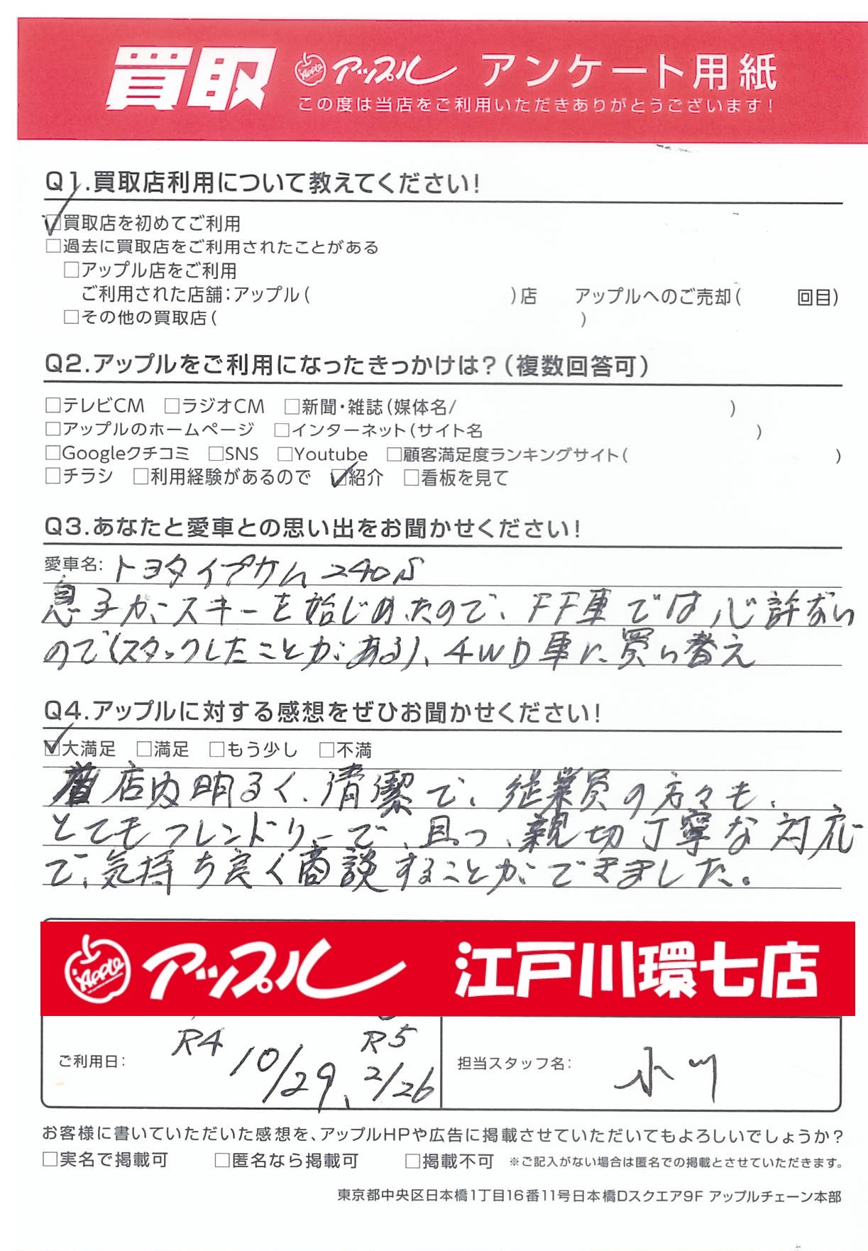 A:息子がスキーを始めたので、FF車では心もたないので(スタックしたことがある)、4WD車に乗り換え。