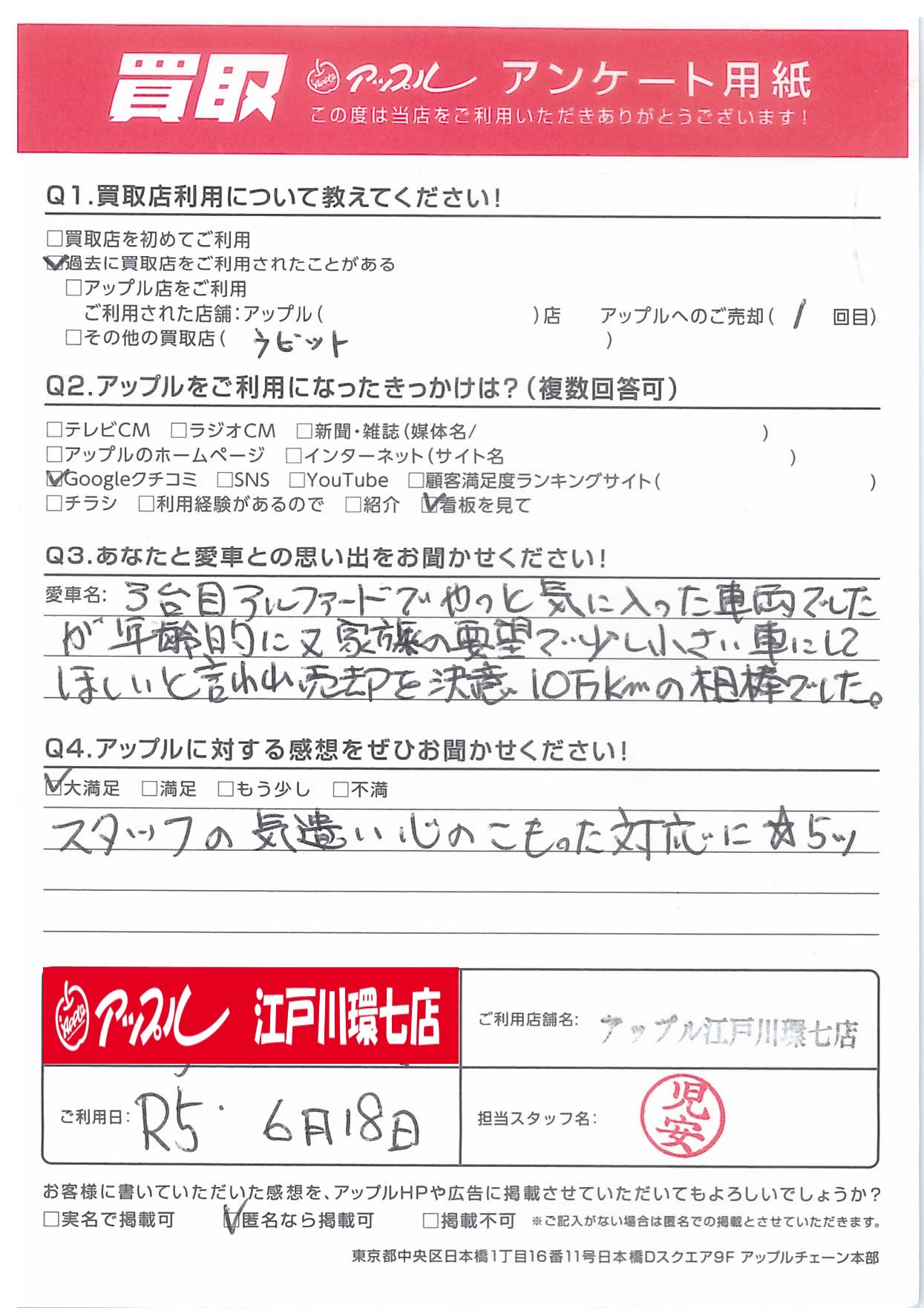 A: 3代目のアルファードでやっと気に入った車両でしたが、年齢的に又、家族の要望で少し小さい車にしてほしい言われ売却を決意、10万キロの相棒でした。