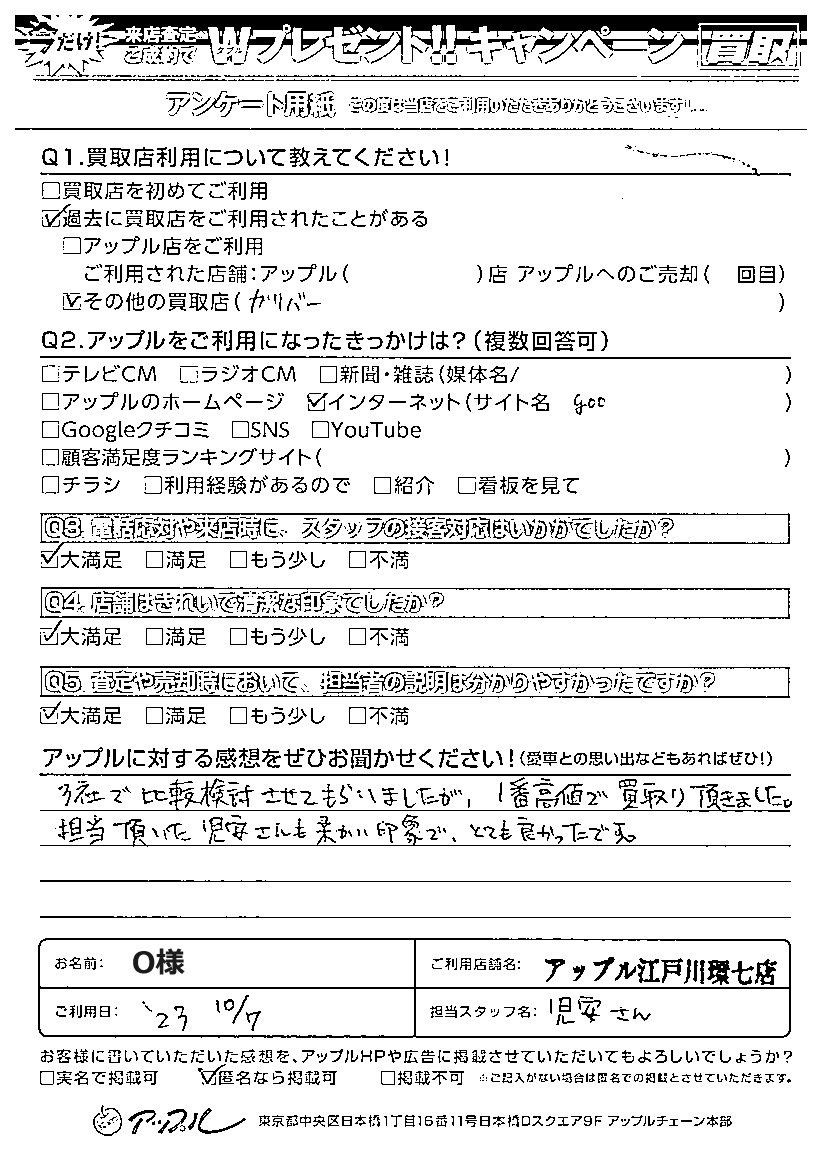 お車のご相談・ 査定だけでもOK! カンタン 入力 30秒 アップルがブランド買取始めました! お電話でも受付中! 受付時間10:00 ~ 19:00(最終査定受付時間は18:00です) 03-5658-0393 お車のご相談・ 査定だけでもOK! カンタン 入力 30秒 アップルがブランド買取始めました! お電話でも受付中! 受付時間10:00 ~ 19:00(最終査定受付時間は18:00です) 03-5658-0393 アップルがブランド買取始めました! お電話でも受付中! 受付時間10:00 ~ 19:00(最終査定受付時間は18:00です) 03-5658-0393 店舗情報 在庫車 スタッフ紹介 ブログ お客様の声 キャンペーン お得 無料査定 click お客様の声 ご記入日: 2023/12/16 O様 ご利用日:2023年10月7日 担当:児安Q.アップルに対する感想をぜひお聞かせください!大満足3社で比較検討させてもらいましたが、1番高値で買取り頂きました。担当頂いた児安さんも柔らかい印象でとても良かったです。 前へ 次へ お客様の声一覧を見る