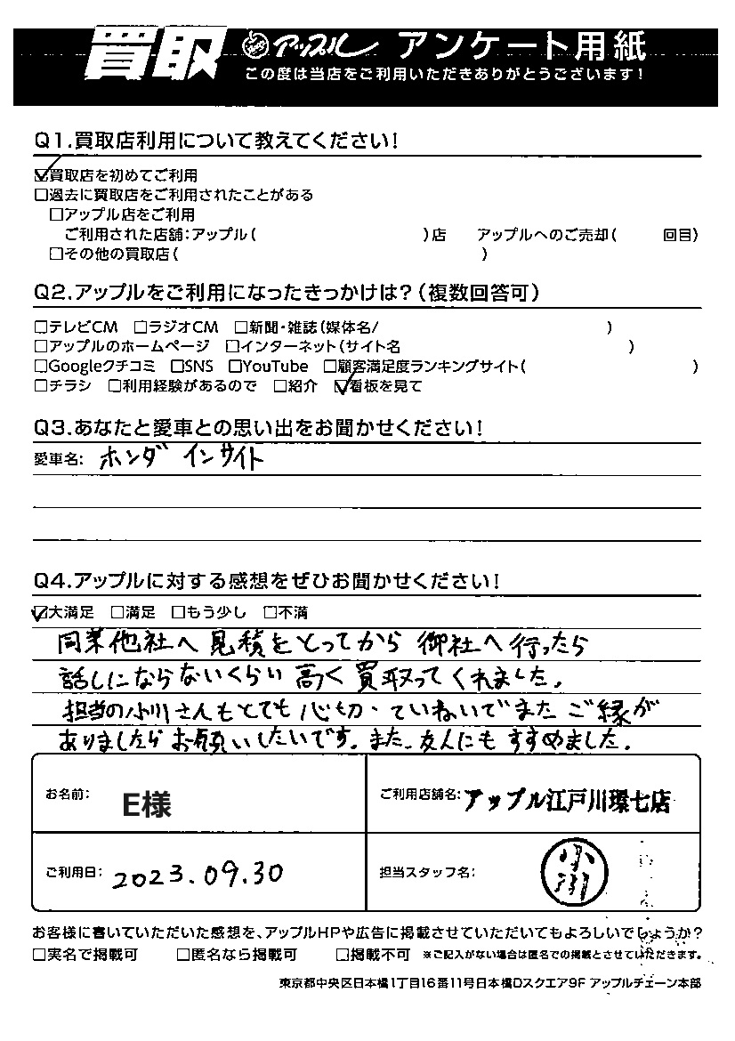E様 車名:ホンダ インサイト