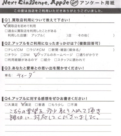 お車のご相談・ 査定だけでもOK! カンタン 入力 30秒 アップルがブランド買取始めました! お電話でも受付中! 受付時間10:00 ~ 19:00(最終査定受付時間は18:00です) 03-5658-0393 お車のご相談・ 査定だけでもOK! カンタン 入力 30秒 アップルがブランド買取始めました! お電話でも受付中! 受付時間10:00 ~ 19:00(最終査定受付時間は18:00です) 03-5658-0393 アップルがブランド買取始めました! お電話でも受付中! 受付時間10:00 ~ 19:00(最終査定受付時間は18:00です) 03-5658-0393 店舗情報 在庫車 スタッフ紹介 ブログ お客様の声 キャンペーン お得 無料査定 click お客様の声 ご記入日: 2015/12/18 H様 こちらの要望を多少取り入れて頂き、親切に、対応してくださいました。 前へ 次へ お客様の声一覧を見る