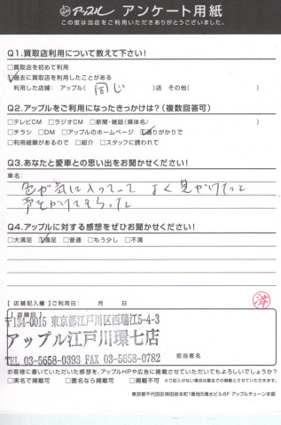 お車のご相談・ 査定だけでもOK! カンタン 入力 30秒 アップルがブランド買取始めました! お電話でも受付中! 受付時間10:00 ~ 19:00(最終査定受付時間は18:00です) 03-5658-0393 お車のご相談・ 査定だけでもOK! カンタン 入力 30秒 アップルがブランド買取始めました! お電話でも受付中! 受付時間10:00 ~ 19:00(最終査定受付時間は18:00です) 03-5658-0393 アップルがブランド買取始めました! お電話でも受付中! 受付時間10:00 ~ 19:00(最終査定受付時間は18:00です) 03-5658-0393 店舗情報 在庫車 スタッフ紹介 ブログ お客様の声 キャンペーン お得 無料査定 click お客様の声 ご記入日: 2016/02/07 H様 色が気に入っていて、よく見かけたと声をかけてもらった 前へ 次へ お客様の声一覧を見る
