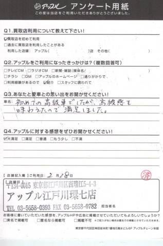 お車のご相談・ 査定だけでもOK! カンタン 入力 30秒 アップルがブランド買取始めました! お電話でも受付中! 受付時間10:00 ~ 19:00(最終査定受付時間は18:00です) 03-5658-0393 お車のご相談・ 査定だけでもOK! カンタン 入力 30秒 アップルがブランド買取始めました! お電話でも受付中! 受付時間10:00 ~ 19:00(最終査定受付時間は18:00です) 03-5658-0393 アップルがブランド買取始めました! お電話でも受付中! 受付時間10:00 ~ 19:00(最終査定受付時間は18:00です) 03-5658-0393 店舗情報 在庫車 スタッフ紹介 ブログ お客様の声 キャンペーン お得 無料査定 click お客様の声 ご記入日: 2016/02/28 O様 初めての高級車でしたが、高級感を味わえたので満足しました。 前へ 次へ お客様の声一覧を見る