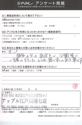 お車のご相談・ 査定だけでもOK! カンタン 入力 30秒 アップルがブランド買取始めました! お電話でも受付中! 受付時間10:00 ~ 19:00(最終査定受付時間は18:00です) 03-5658-0393 お車のご相談・ 査定だけでもOK! カンタン 入力 30秒 アップルがブランド買取始めました! お電話でも受付中! 受付時間10:00 ~ 19:00(最終査定受付時間は18:00です) 03-5658-0393 アップルがブランド買取始めました! お電話でも受付中! 受付時間10:00 ~ 19:00(最終査定受付時間は18:00です) 03-5658-0393 店舗情報 在庫車 スタッフ紹介 ブログ お客様の声 キャンペーン お得 無料査定 click お客様の声 ご記入日: 2016/01/11 K様 病気の父の送迎をし、公園等に一緒に行ったとても思い出のある車です。 前へ 次へ お客様の声一覧を見る