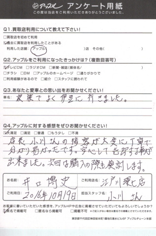 お車のご相談・ 査定だけでもOK! カンタン 入力 30秒 アップルがブランド買取始めました! お電話でも受付中! 受付時間10:00 ~ 19:00(最終査定受付時間は18:00です) 03-5658-0393 お車のご相談・ 査定だけでもOK! カンタン 入力 30秒 アップルがブランド買取始めました! お電話でも受付中! 受付時間10:00 ~ 19:00(最終査定受付時間は18:00です) 03-5658-0393 アップルがブランド買取始めました! お電話でも受付中! 受付時間10:00 ~ 19:00(最終査定受付時間は18:00です) 03-5658-0393 店舗情報 在庫車 スタッフ紹介 ブログ お客様の声 キャンペーン お得 無料査定 click お客様の声 ご記入日: 2016/10/19 井口 博史様 ☆愛車との思い出をお聞かせください!☆家族でよく伊豆に行きました。☆アップルに対する感想をお聞かせください!☆店長 小川さんの接客が大変に丁寧で分かり易かったです。安心して売却する事が出来ました。次回は購入の際も検討します。 前へ 次へ お客様の声一覧を見る