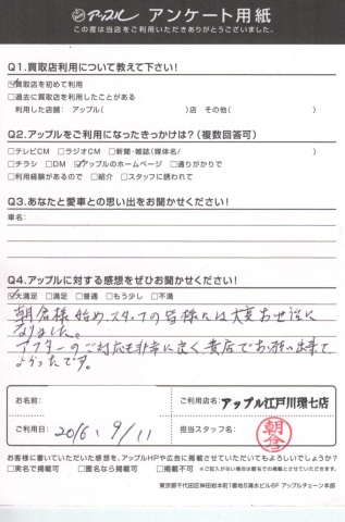 お車のご相談・ 査定だけでもOK! カンタン 入力 30秒 アップルがブランド買取始めました! お電話でも受付中! 受付時間10:00 ~ 19:00(最終査定受付時間は18:00です) 03-5658-0393 お車のご相談・ 査定だけでもOK! カンタン 入力 30秒 アップルがブランド買取始めました! お電話でも受付中! 受付時間10:00 ~ 19:00(最終査定受付時間は18:00です) 03-5658-0393 アップルがブランド買取始めました! お電話でも受付中! 受付時間10:00 ~ 19:00(最終査定受付時間は18:00です) 03-5658-0393 店舗情報 在庫車 スタッフ紹介 ブログ お客様の声 キャンペーン お得 無料査定 click お客様の声 ご記入日: 2016/09/11 N様 ☆愛車との思い出をお聞かせください!☆☆アップルに対する感想をお聞かせください!☆朝倉様始め、スタッフの皆様には大変お世話になりました。アフターのご対応も非常に良く、貴社でお願い出来てよかったです。 前へ 次へ お客様の声一覧を見る