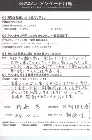 営業マンの方と楽しくお話をしながら査定して頂き、他社と同額程度、たとえ少し位安く出てもお願いするつもりになりました。