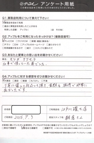 お車のご相談・ 査定だけでもOK! カンタン 入力 30秒 アップルがブランド買取始めました! お電話でも受付中! 受付時間10:00 ~ 19:00(最終査定受付時間は18:00です) 03-5658-0393 お車のご相談・ 査定だけでもOK! カンタン 入力 30秒 アップルがブランド買取始めました! お電話でも受付中! 受付時間10:00 ~ 19:00(最終査定受付時間は18:00です) 03-5658-0393 アップルがブランド買取始めました! お電話でも受付中! 受付時間10:00 ~ 19:00(最終査定受付時間は18:00です) 03-5658-0393 店舗情報 在庫車 スタッフ紹介 ブログ お客様の声 キャンペーン お得 無料査定 click お客様の声 ご記入日: 2016/07/03 K様 Q:愛車との思い出をお聞かせください!車名:アクセラ仕事で使っていた車でした。Q:アップルに対する感想をぜひお聞かせください!丁寧に優しく対応して頂き、金額も納得で非常に良かったです。 前へ 次へ お客様の声一覧を見る