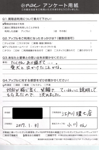 お車のご相談・ 査定だけでもOK! カンタン 入力 30秒 アップルがブランド買取始めました! お電話でも受付中! 受付時間10:00 ~ 19:00(最終査定受付時間は18:00です) 03-5658-0393 お車のご相談・ 査定だけでもOK! カンタン 入力 30秒 アップルがブランド買取始めました! お電話でも受付中! 受付時間10:00 ~ 19:00(最終査定受付時間は18:00です) 03-5658-0393 アップルがブランド買取始めました! お電話でも受付中! 受付時間10:00 ~ 19:00(最終査定受付時間は18:00です) 03-5658-0393 店舗情報 在庫車 スタッフ紹介 ブログ お客様の声 キャンペーン お得 無料査定 click お客様の声 ご記入日: 2017/01/31 J様 Q: あなと愛車の思い出をお聞かせください! たくさんあり過ぎて・・・。 愛犬と出かけたことかな。Q: アップルに対する感想をぜひお聞かせください! 対応が感じ良く、笑顔で、ていねいに説明してもらえたので、決めました。 前へ 次へ お客様の声一覧を見る