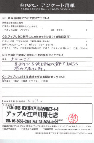 お車のご相談・ 査定だけでもOK! カンタン 入力 30秒 アップルがブランド買取始めました! お電話でも受付中! 受付時間10:00 ~ 19:00(最終査定受付時間は18:00です) 03-5658-0393 お車のご相談・ 査定だけでもOK! カンタン 入力 30秒 アップルがブランド買取始めました! お電話でも受付中! 受付時間10:00 ~ 19:00(最終査定受付時間は18:00です) 03-5658-0393 アップルがブランド買取始めました! お電話でも受付中! 受付時間10:00 ~ 19:00(最終査定受付時間は18:00です) 03-5658-0393 店舗情報 在庫車 スタッフ紹介 ブログ お客様の声 キャンペーン お得 無料査定 click お客様の声 ご記入日: 2017/02/12 Y様 ☆ あなたとの愛車の思い出をお聞かせください!愛車名:オデッセイ生まれた子供を初めて乗せて自宅へ連れて来た時。☆ アップルに対する感想をぜひお聞かせください!大満足 前へ 次へ お客様の声一覧を見る
