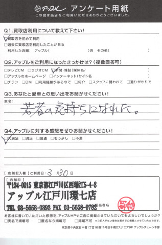 お車のご相談・ 査定だけでもOK! カンタン 入力 30秒 アップルがブランド買取始めました! お電話でも受付中! 受付時間10:00 ~ 19:00(最終査定受付時間は18:00です) 03-5658-0393 お車のご相談・ 査定だけでもOK! カンタン 入力 30秒 アップルがブランド買取始めました! お電話でも受付中! 受付時間10:00 ~ 19:00(最終査定受付時間は18:00です) 03-5658-0393 アップルがブランド買取始めました! お電話でも受付中! 受付時間10:00 ~ 19:00(最終査定受付時間は18:00です) 03-5658-0393 店舗情報 在庫車 スタッフ紹介 ブログ お客様の声 キャンペーン お得 無料査定 click お客様の声 ご記入日: 2017/03/30 A様 ☆ あなたとの愛車の思い出をお聞かせください!若者の気持ちになれた。☆ アップルに対する感想をぜひお聞かせください!大満足 前へ 次へ お客様の声一覧を見る