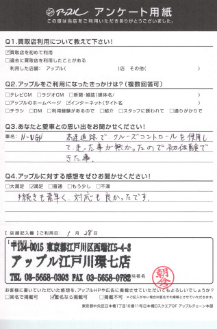 お車のご相談・ 査定だけでもOK! カンタン 入力 30秒 アップルがブランド買取始めました! お電話でも受付中! 受付時間10:00 ~ 19:00(最終査定受付時間は18:00です) 03-5658-0393 お車のご相談・ 査定だけでもOK! カンタン 入力 30秒 アップルがブランド買取始めました! お電話でも受付中! 受付時間10:00 ~ 19:00(最終査定受付時間は18:00です) 03-5658-0393 アップルがブランド買取始めました! お電話でも受付中! 受付時間10:00 ~ 19:00(最終査定受付時間は18:00です) 03-5658-0393 店舗情報 在庫車 スタッフ紹介 ブログ お客様の声 キャンペーン お得 無料査定 click お客様の声 ご記入日: 2017/01/28 H様 ☆ あなたとの愛車の思い出をお聞かせください!車名:N-WGN高速道路で、クルーズコントロールを使用して走った事が無かったので初体験出来た事。☆ アップルに対する感想をぜひお聞かせください!満足手続きも素早く、対応も良かったです。 前へ 次へ お客様の声一覧を見る