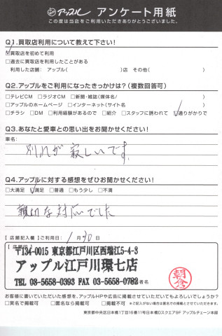 お車のご相談・ 査定だけでもOK! カンタン 入力 30秒 アップルがブランド買取始めました! お電話でも受付中! 受付時間10:00 ~ 19:00(最終査定受付時間は18:00です) 03-5658-0393 お車のご相談・ 査定だけでもOK! カンタン 入力 30秒 アップルがブランド買取始めました! お電話でも受付中! 受付時間10:00 ~ 19:00(最終査定受付時間は18:00です) 03-5658-0393 アップルがブランド買取始めました! お電話でも受付中! 受付時間10:00 ~ 19:00(最終査定受付時間は18:00です) 03-5658-0393 店舗情報 在庫車 スタッフ紹介 ブログ お客様の声 キャンペーン お得 無料査定 click お客様の声 ご記入日: 2017/01/30 S様 ☆ あなたとの愛車の思い出をお聞かせください!別れが寂しいです。☆ アップルに対する感想をぜひお聞かせください!満足親切な対応でした。 前へ 次へ お客様の声一覧を見る