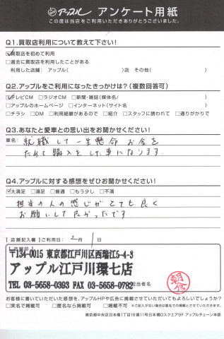 お車のご相談・ 査定だけでもOK! カンタン 入力 30秒 アップルがブランド買取始めました! お電話でも受付中! 受付時間10:00 ~ 19:00(最終査定受付時間は18:00です) 03-5658-0393 お車のご相談・ 査定だけでもOK! カンタン 入力 30秒 アップルがブランド買取始めました! お電話でも受付中! 受付時間10:00 ~ 19:00(最終査定受付時間は18:00です) 03-5658-0393 アップルがブランド買取始めました! お電話でも受付中! 受付時間10:00 ~ 19:00(最終査定受付時間は18:00です) 03-5658-0393 店舗情報 在庫車 スタッフ紹介 ブログ お客様の声 キャンペーン お得 無料査定 click お客様の声 ご記入日: 2017/02/01 I様 ☆ あなたとの愛車の思い出をお聞かせください!就職して一生懸命お金をためて購入をした車になります。☆ アップルに対する感想をぜひお聞かせください!大満足担当の人の感じがとても良くお願いして良かったです。 前へ 次へ お客様の声一覧を見る