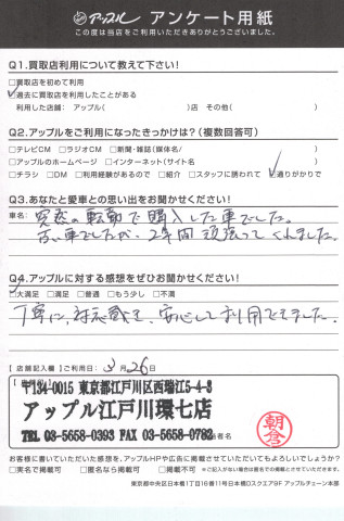お車のご相談・ 査定だけでもOK! カンタン 入力 30秒 アップルがブランド買取始めました! お電話でも受付中! 受付時間10:00 ~ 19:00(最終査定受付時間は18:00です) 03-5658-0393 お車のご相談・ 査定だけでもOK! カンタン 入力 30秒 アップルがブランド買取始めました! お電話でも受付中! 受付時間10:00 ~ 19:00(最終査定受付時間は18:00です) 03-5658-0393 アップルがブランド買取始めました! お電話でも受付中! 受付時間10:00 ~ 19:00(最終査定受付時間は18:00です) 03-5658-0393 店舗情報 在庫車 スタッフ紹介 ブログ お客様の声 キャンペーン お得 無料査定 click お客様の声 ご記入日: 2017/03/26 A様 ☆ あなたとの愛車の思い出をお聞かせください!突然の転勤で購入した車でした。古い車でしたが、2年間頑張ってくれました。☆ アップルに対する感想をぜひお聞かせください!大満足丁寧に、対応戴き、安心して利用できました。 前へ 次へ お客様の声一覧を見る