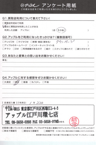 お車のご相談・ 査定だけでもOK! カンタン 入力 30秒 アップルがブランド買取始めました! お電話でも受付中! 受付時間10:00 ~ 19:00(最終査定受付時間は18:00です) 03-5658-0393 お車のご相談・ 査定だけでもOK! カンタン 入力 30秒 アップルがブランド買取始めました! お電話でも受付中! 受付時間10:00 ~ 19:00(最終査定受付時間は18:00です) 03-5658-0393 アップルがブランド買取始めました! お電話でも受付中! 受付時間10:00 ~ 19:00(最終査定受付時間は18:00です) 03-5658-0393 店舗情報 在庫車 スタッフ紹介 ブログ お客様の声 キャンペーン お得 無料査定 click お客様の声 ご記入日: 2017/01/22 N様 ☆ アップルに対する感想をぜひお聞かせください!満足 前へ 次へ お客様の声一覧を見る