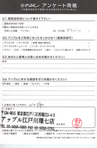 お車のご相談・ 査定だけでもOK! カンタン 入力 30秒 アップルがブランド買取始めました! お電話でも受付中! 受付時間10:00 ~ 19:00(最終査定受付時間は18:00です) 03-5658-0393 お車のご相談・ 査定だけでもOK! カンタン 入力 30秒 アップルがブランド買取始めました! お電話でも受付中! 受付時間10:00 ~ 19:00(最終査定受付時間は18:00です) 03-5658-0393 アップルがブランド買取始めました! お電話でも受付中! 受付時間10:00 ~ 19:00(最終査定受付時間は18:00です) 03-5658-0393 店舗情報 在庫車 スタッフ紹介 ブログ お客様の声 キャンペーン お得 無料査定 click お客様の声 ご記入日: 2017/02/14 E様 ☆ アップルに対する感想をぜひお聞かせください!大満足 前へ 次へ お客様の声一覧を見る