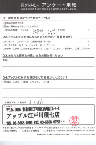 お車のご相談・ 査定だけでもOK! カンタン 入力 30秒 アップルがブランド買取始めました! お電話でも受付中! 受付時間10:00 ~ 19:00(最終査定受付時間は18:00です) 03-5658-0393 お車のご相談・ 査定だけでもOK! カンタン 入力 30秒 アップルがブランド買取始めました! お電話でも受付中! 受付時間10:00 ~ 19:00(最終査定受付時間は18:00です) 03-5658-0393 アップルがブランド買取始めました! お電話でも受付中! 受付時間10:00 ~ 19:00(最終査定受付時間は18:00です) 03-5658-0393 店舗情報 在庫車 スタッフ紹介 ブログ お客様の声 キャンペーン お得 無料査定 click お客様の声 ご記入日: 2017/03/31 K様 ☆ アップルに対する感想をぜひお聞かせください!大満足 前へ 次へ お客様の声一覧を見る