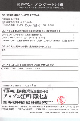 お車のご相談・ 査定だけでもOK! カンタン 入力 30秒 アップルがブランド買取始めました! お電話でも受付中! 受付時間10:00 ~ 19:00(最終査定受付時間は18:00です) 03-5658-0393 お車のご相談・ 査定だけでもOK! カンタン 入力 30秒 アップルがブランド買取始めました! お電話でも受付中! 受付時間10:00 ~ 19:00(最終査定受付時間は18:00です) 03-5658-0393 アップルがブランド買取始めました! お電話でも受付中! 受付時間10:00 ~ 19:00(最終査定受付時間は18:00です) 03-5658-0393 店舗情報 在庫車 スタッフ紹介 ブログ お客様の声 キャンペーン お得 無料査定 click お客様の声 ご記入日: 2017/02/12 T様 ☆ アップルに対する感想をぜひお聞かせください!大満足 前へ 次へ お客様の声一覧を見る