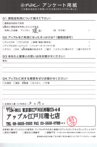 お車のご相談・ 査定だけでもOK! カンタン 入力 30秒 アップルがブランド買取始めました! お電話でも受付中! 受付時間10:00 ~ 19:00(最終査定受付時間は18:00です) 03-5658-0393 お車のご相談・ 査定だけでもOK! カンタン 入力 30秒 アップルがブランド買取始めました! お電話でも受付中! 受付時間10:00 ~ 19:00(最終査定受付時間は18:00です) 03-5658-0393 アップルがブランド買取始めました! お電話でも受付中! 受付時間10:00 ~ 19:00(最終査定受付時間は18:00です) 03-5658-0393 店舗情報 在庫車 スタッフ紹介 ブログ お客様の声 キャンペーン お得 無料査定 click お客様の声 ご記入日: 2017/03/19 T様 ☆ アップルに対する感想をぜひお聞かせください!普通 前へ 次へ お客様の声一覧を見る