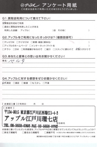 お車のご相談・ 査定だけでもOK! カンタン 入力 30秒 アップルがブランド買取始めました! お電話でも受付中! 受付時間10:00 ~ 19:00(最終査定受付時間は18:00です) 03-5658-0393 お車のご相談・ 査定だけでもOK! カンタン 入力 30秒 アップルがブランド買取始めました! お電話でも受付中! 受付時間10:00 ~ 19:00(最終査定受付時間は18:00です) 03-5658-0393 アップルがブランド買取始めました! お電話でも受付中! 受付時間10:00 ~ 19:00(最終査定受付時間は18:00です) 03-5658-0393 店舗情報 在庫車 スタッフ紹介 ブログ お客様の声 キャンペーン お得 無料査定 click お客様の声 ご記入日: 2017/01/18 A様 車名:ベルタ☆ アップルに対する感想をぜひお聞かせください!大満足 前へ 次へ お客様の声一覧を見る