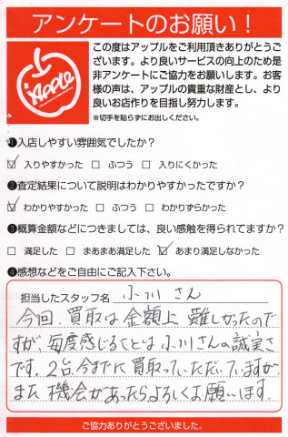 お車のご相談・ 査定だけでもOK! カンタン 入力 30秒 アップルがブランド買取始めました! お電話でも受付中! 受付時間10:00 ~ 19:00(最終査定受付時間は18:00です) 03-5658-0393 お車のご相談・ 査定だけでもOK! カンタン 入力 30秒 アップルがブランド買取始めました! お電話でも受付中! 受付時間10:00 ~ 19:00(最終査定受付時間は18:00です) 03-5658-0393 アップルがブランド買取始めました! お電話でも受付中! 受付時間10:00 ~ 19:00(最終査定受付時間は18:00です) 03-5658-0393 店舗情報 在庫車 スタッフ紹介 ブログ お客様の声 キャンペーン お得 無料査定 click お客様の声 ご記入日: 2017/10/09 M様 今回、買取りは金額上難しかったのですが、毎回感じることは小川さんの誠実さです。2台今まで買取っていただいていますが、また機会があったらよろしくお願いします。 前へ 次へ お客様の声一覧を見る