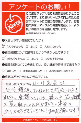 お車のご相談・ 査定だけでもOK! カンタン 入力 30秒 アップルがブランド買取始めました! お電話でも受付中! 受付時間10:00 ~ 19:00(最終査定受付時間は18:00です) 03-5658-0393 お車のご相談・ 査定だけでもOK! カンタン 入力 30秒 アップルがブランド買取始めました! お電話でも受付中! 受付時間10:00 ~ 19:00(最終査定受付時間は18:00です) 03-5658-0393 アップルがブランド買取始めました! お電話でも受付中! 受付時間10:00 ~ 19:00(最終査定受付時間は18:00です) 03-5658-0393 店舗情報 在庫車 スタッフ紹介 ブログ お客様の声 キャンペーン お得 無料査定 click お客様の声 ご記入日: 2017/09/15 A様 とても親切、ていねいにご対応いただきました。金額についても、厳しい中、良い金額で買い取っていただけました。本当にありがとうございました!またお願いします!! 前へ 次へ お客様の声一覧を見る