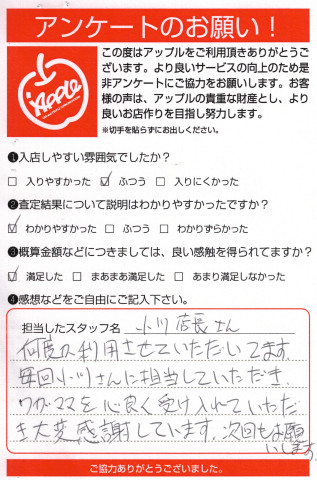 お車のご相談・ 査定だけでもOK! カンタン 入力 30秒 アップルがブランド買取始めました! お電話でも受付中! 受付時間10:00 ~ 19:00(最終査定受付時間は18:00です) 03-5658-0393 お車のご相談・ 査定だけでもOK! カンタン 入力 30秒 アップルがブランド買取始めました! お電話でも受付中! 受付時間10:00 ~ 19:00(最終査定受付時間は18:00です) 03-5658-0393 アップルがブランド買取始めました! お電話でも受付中! 受付時間10:00 ~ 19:00(最終査定受付時間は18:00です) 03-5658-0393 店舗情報 在庫車 スタッフ紹介 ブログ お客様の声 キャンペーン お得 無料査定 click お客様の声 ご記入日: 2017/08/30 H様 何度か利用させていただいています。毎回小川さんに担当していただき、ワガママを心良く受け入れていただき大変感謝しています。次回もお願いします。 前へ 次へ お客様の声一覧を見る