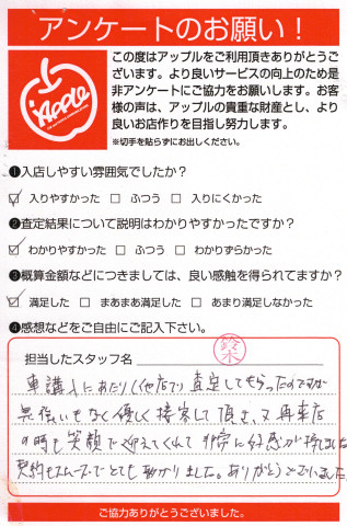 お車のご相談・ 査定だけでもOK! カンタン 入力 30秒 アップルがブランド買取始めました! お電話でも受付中! 受付時間10:00 ~ 19:00(最終査定受付時間は18:00です) 03-5658-0393 お車のご相談・ 査定だけでもOK! カンタン 入力 30秒 アップルがブランド買取始めました! お電話でも受付中! 受付時間10:00 ~ 19:00(最終査定受付時間は18:00です) 03-5658-0393 アップルがブランド買取始めました! お電話でも受付中! 受付時間10:00 ~ 19:00(最終査定受付時間は18:00です) 03-5658-0393 店舗情報 在庫車 スタッフ紹介 ブログ お客様の声 キャンペーン お得 無料査定 click お客様の声 ご記入日: 2017/07/28 H様 車の購入にあたり(他店で)査定してもらったのですが無理強いもなく優しく接客して頂き、又再来店の時も笑顔で迎えてて非常に好感が持てました。契約もスムーズでとても助かりました。ありがとうございました。 前へ 次へ お客様の声一覧を見る