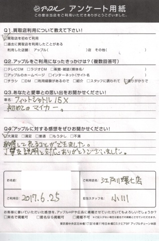お車のご相談・ 査定だけでもOK! カンタン 入力 30秒 アップルがブランド買取始めました! お電話でも受付中! 受付時間10:00 ~ 19:00(最終査定受付時間は18:00です) 03-5658-0393 お車のご相談・ 査定だけでもOK! カンタン 入力 30秒 アップルがブランド買取始めました! お電話でも受付中! 受付時間10:00 ~ 19:00(最終査定受付時間は18:00です) 03-5658-0393 アップルがブランド買取始めました! お電話でも受付中! 受付時間10:00 ~ 19:00(最終査定受付時間は18:00です) 03-5658-0393 店舗情報 在庫車 スタッフ紹介 ブログ お客様の声 キャンペーン お得 無料査定 click お客様の声 ご記入日: 2017/06/25 Y様 車名: フィットシャトルQ:あなたと愛車の思い出をお聞かせください!A:初めてのマイカー。Q:アップルに対する感想をぜひお聞かせください!A:大満足 納得して売ることができました。 丁寧な説明と対応ありがとうございました。 前へ 次へ お客様の声一覧を見る