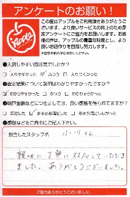 お車のご相談・ 査定だけでもOK! カンタン 入力 30秒 アップルがブランド買取始めました! お電話でも受付中! 受付時間10:00 ~ 19:00(最終査定受付時間は18:00です) 03-5658-0393 お車のご相談・ 査定だけでもOK! カンタン 入力 30秒 アップルがブランド買取始めました! お電話でも受付中! 受付時間10:00 ~ 19:00(最終査定受付時間は18:00です) 03-5658-0393 アップルがブランド買取始めました! お電話でも受付中! 受付時間10:00 ~ 19:00(最終査定受付時間は18:00です) 03-5658-0393 店舗情報 在庫車 スタッフ紹介 ブログ お客様の声 キャンペーン お得 無料査定 click お客様の声 ご記入日: 2018/02/03 S様 親切に丁寧に対応していただきました。ありがとうございました。 前へ 次へ お客様の声一覧を見る