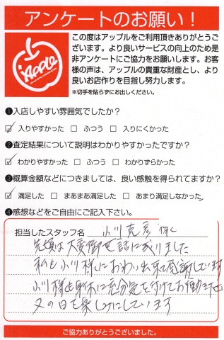 お車のご相談・ 査定だけでもOK! カンタン 入力 30秒 アップルがブランド買取始めました! お電話でも受付中! 受付時間10:00 ~ 19:00(最終査定受付時間は18:00です) 03-5658-0393 お車のご相談・ 査定だけでもOK! カンタン 入力 30秒 アップルがブランド買取始めました! お電話でも受付中! 受付時間10:00 ~ 19:00(最終査定受付時間は18:00です) 03-5658-0393 アップルがブランド買取始めました! お電話でも受付中! 受付時間10:00 ~ 19:00(最終査定受付時間は18:00です) 03-5658-0393 店舗情報 在庫車 スタッフ紹介 ブログ お客様の声 キャンペーン お得 無料査定 click お客様の声 ご記入日: 2018/08/18 I様 先頃は大変お世話に成りました。私も小川様におわい出来て感謝しています。小川様も身休に十分気を付けてお働きください。又の日を楽しみにしています。 前へ 次へ お客様の声一覧を見る