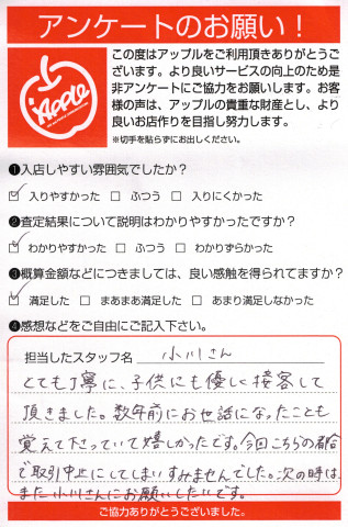 お車のご相談・ 査定だけでもOK! カンタン 入力 30秒 アップルがブランド買取始めました! お電話でも受付中! 受付時間10:00 ~ 19:00(最終査定受付時間は18:00です) 03-5658-0393 お車のご相談・ 査定だけでもOK! カンタン 入力 30秒 アップルがブランド買取始めました! お電話でも受付中! 受付時間10:00 ~ 19:00(最終査定受付時間は18:00です) 03-5658-0393 アップルがブランド買取始めました! お電話でも受付中! 受付時間10:00 ~ 19:00(最終査定受付時間は18:00です) 03-5658-0393 店舗情報 在庫車 スタッフ紹介 ブログ お客様の声 キャンペーン お得 無料査定 click お客様の声 ご記入日: 2018/08/19 K様 とても丁寧に、子どもにも優しく接客して頂きました。数年前にお世話になったことも覚えて下さっていて嬉しかったです。今回はこちらの都合で取り引き中止になってしまいすみませんでした。次の時は、また小川さんにお願いしたいです。 前へ 次へ お客様の声一覧を見る