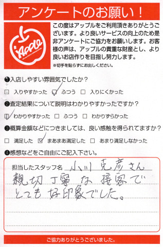 お車のご相談・ 査定だけでもOK! カンタン 入力 30秒 アップルがブランド買取始めました! お電話でも受付中! 受付時間10:00 ~ 19:00(最終査定受付時間は18:00です) 03-5658-0393 お車のご相談・ 査定だけでもOK! カンタン 入力 30秒 アップルがブランド買取始めました! お電話でも受付中! 受付時間10:00 ~ 19:00(最終査定受付時間は18:00です) 03-5658-0393 アップルがブランド買取始めました! お電話でも受付中! 受付時間10:00 ~ 19:00(最終査定受付時間は18:00です) 03-5658-0393 店舗情報 在庫車 スタッフ紹介 ブログ お客様の声 キャンペーン お得 無料査定 click お客様の声 ご記入日: 2018/09/03 X様 親切丁寧な接客でとても好印象でした。 前へ 次へ お客様の声一覧を見る