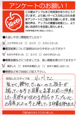 お車のご相談・ 査定だけでもOK! カンタン 入力 30秒 アップルがブランド買取始めました! お電話でも受付中! 受付時間10:00 ~ 19:00(最終査定受付時間は18:00です) 03-5658-0393 お車のご相談・ 査定だけでもOK! カンタン 入力 30秒 アップルがブランド買取始めました! お電話でも受付中! 受付時間10:00 ~ 19:00(最終査定受付時間は18:00です) 03-5658-0393 アップルがブランド買取始めました! お電話でも受付中! 受付時間10:00 ~ 19:00(最終査定受付時間は18:00です) 03-5658-0393 店舗情報 在庫車 スタッフ紹介 ブログ お客様の声 キャンペーン お得 無料査定 click お客様の声 ご記入日: 2018/09/05 A様 気さく、親切、ていねいの三拍子が揃っている方で店員とお客以前に仲良くしたい気持ちが伝わる対応でアップルさんの店長以上の方と節している印象を持ちました! 前へ 次へ お客様の声一覧を見る