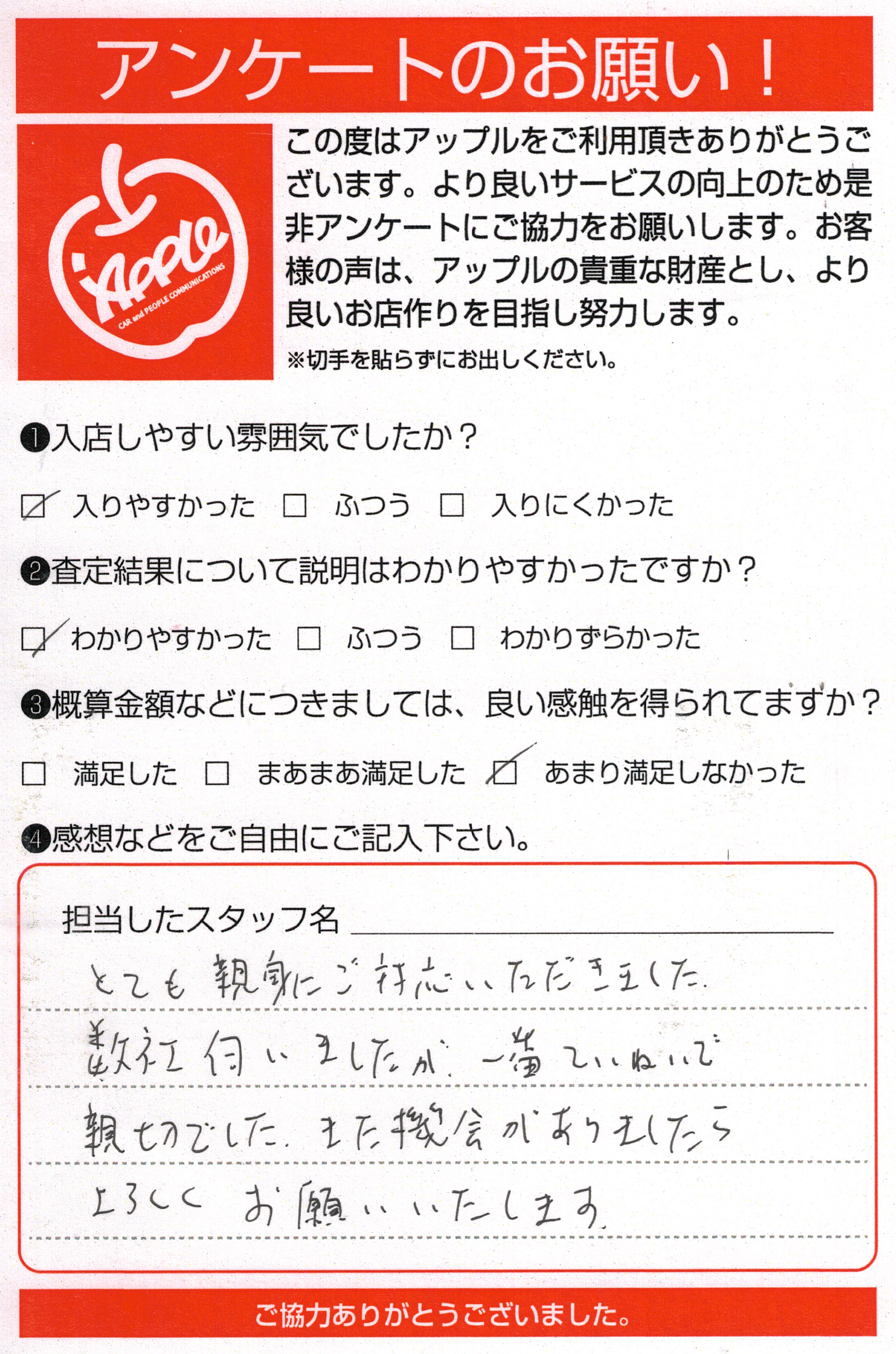 お車のご相談・ 査定だけでもOK! カンタン 入力 30秒 アップルがブランド買取始めました! お電話でも受付中! 受付時間10:00 ~ 19:00(最終査定受付時間は18:00です) 03-5658-0393 お車のご相談・ 査定だけでもOK! カンタン 入力 30秒 アップルがブランド買取始めました! お電話でも受付中! 受付時間10:00 ~ 19:00(最終査定受付時間は18:00です) 03-5658-0393 アップルがブランド買取始めました! お電話でも受付中! 受付時間10:00 ~ 19:00(最終査定受付時間は18:00です) 03-5658-0393 店舗情報 在庫車 スタッフ紹介 ブログ お客様の声 キャンペーン お得 無料査定 click お客様の声 ご記入日: 2019/02/02 M様 車名:レクサス CT (国内仕様 右H) とても親切にご対応いただきました、数社伺いましたが、一番ていねいで、親切でした。また機会がありましたらよろしくお願いいたします。 前へ 次へ お客様の声一覧を見る