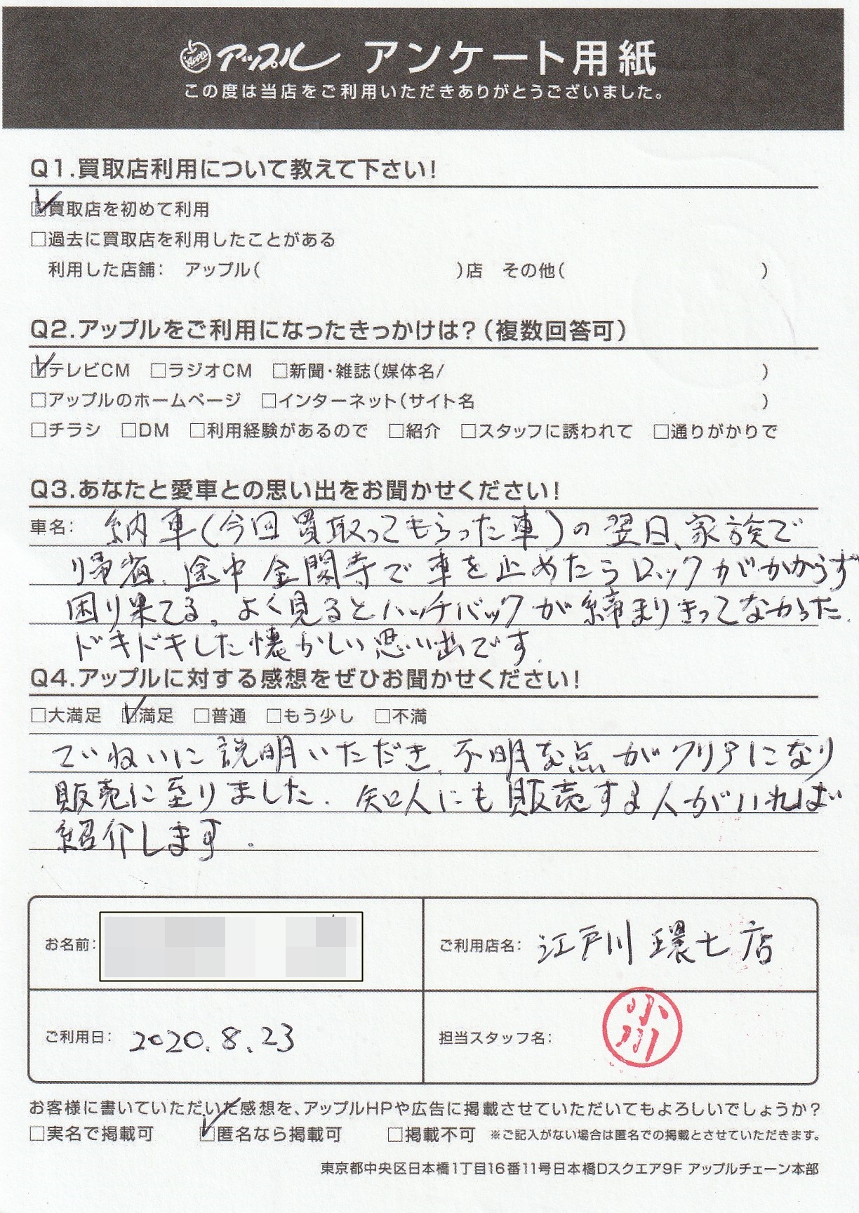A:納車(今回買い取ってもらった車)の翌日、家族で帰省途中金閣寺で車を止めたらロックがかからず困り果てる。