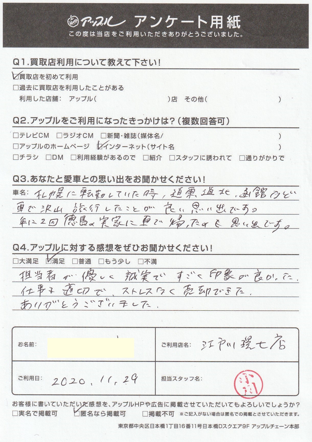 A: 担当者が優しく誠実ですごく印象が良かった。
