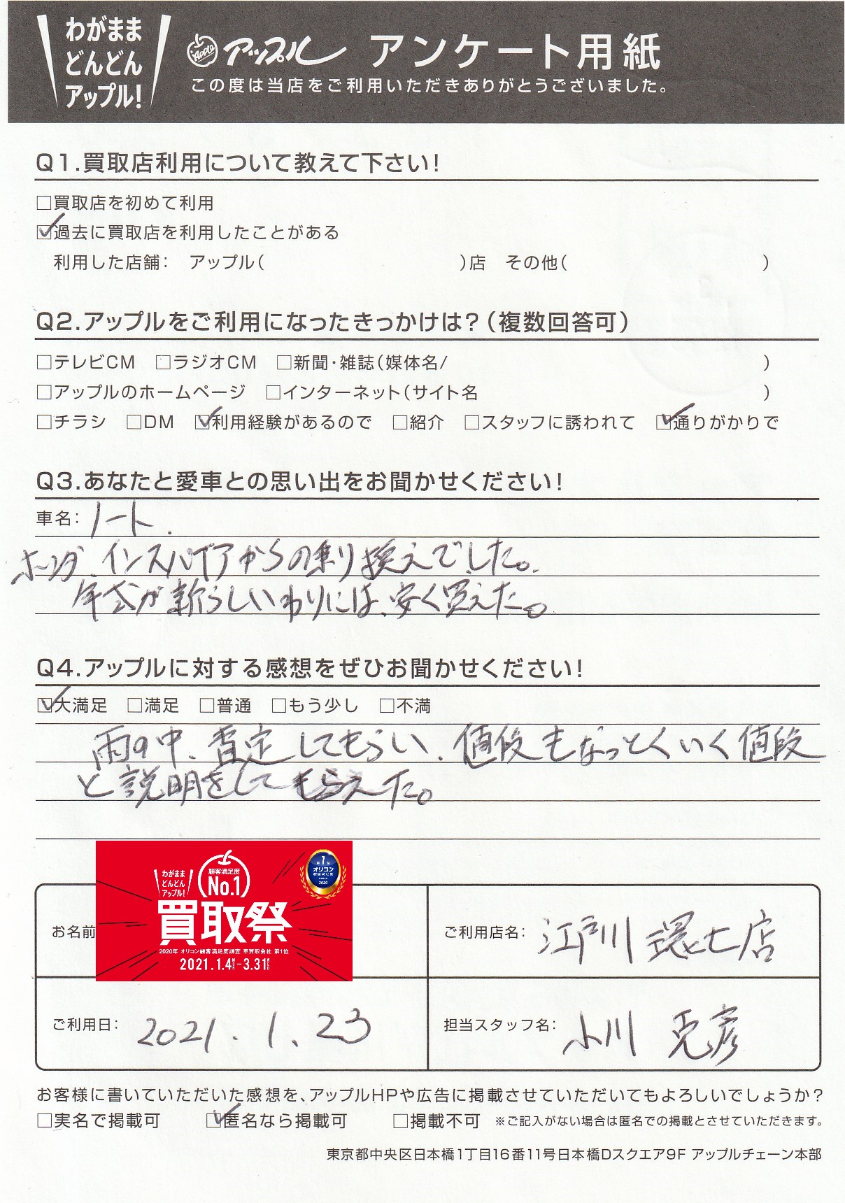 お車のご相談・ 査定だけでもOK! カンタン 入力 30秒 アップルがブランド買取始めました! お電話でも受付中! 受付時間10:00 ~ 19:00(最終査定受付時間は18:00です) 03-5658-0393 お車のご相談・ 査定だけでもOK! カンタン 入力 30秒 アップルがブランド買取始めました! お電話でも受付中! 受付時間10:00 ~ 19:00(最終査定受付時間は18:00です) 03-5658-0393 アップルがブランド買取始めました! お電話でも受付中! 受付時間10:00 ~ 19:00(最終査定受付時間は18:00です) 03-5658-0393 店舗情報 在庫車 スタッフ紹介 ブログ お客様の声 キャンペーン お得 無料査定 click お客様の声 ご記入日: 2021/01/23 T様 車名:日産 ノート Q:あなたと愛車との思い出をお聞かせください!A:ホンダインスパイアからの乗り換えでした。年式が新しいわりには、安く買えた。Q:アップルに対する感想をぜひお聞かせください!A:雨の中、査定をしてもらい、値段もなっとくいく値段と説明をしてもらえた。 前へ 次へ お客様の声一覧を見る