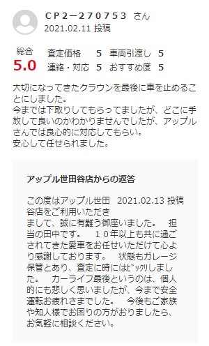 大切になってきたクラウンを最後に車を止めることにしました。 今までは下取りしてもらってましたが、どこに手放して良いのかわかりませんでしたが、アップルさんでは良心的に対応してもらい。 安心して任せられました。