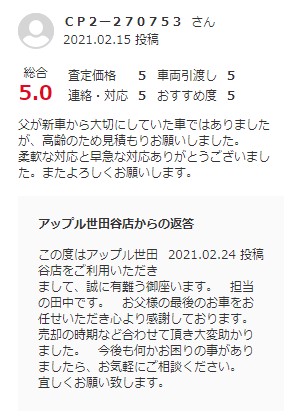 お車のご相談・ 査定だけでもOK! カンタン 入力 30秒 アップルがブランド買取始めました! お電話でも受付中! 受付時間10:00 ~ 19:00 0120-037-315 お車のご相談・ 査定だけでもOK! カンタン 入力 30秒 アップルがブランド買取始めました! お電話でも受付中! 受付時間10:00 ~ 19:00 0120-037-315 アップルがブランド買取始めました! お電話でも受付中! 受付時間10:00 ~ 19:00 0120-037-315 店舗情報 在庫車 スタッフ紹介 ブログ お客様の声 キャンペーン お得 無料査定 click お客様の声 ご記入日: 2021/02/15 東京都調布市 ご利用日:2021/2/9 グー買取より T様 車名:フォルクスワーゲン ポロ 父が新車から大切にしていた車ではありましたが、高齢のため見積もりお願いしました。 柔軟な対応と早急な対応ありがとうございました。またよろしくお願いします。 前へ 次へ お客様の声一覧を見る