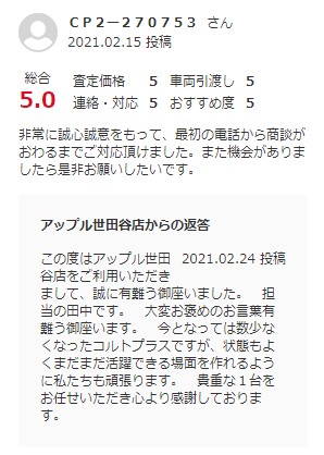 お車のご相談・ 査定だけでもOK! カンタン 入力 30秒 アップルがブランド買取始めました! お電話でも受付中! 受付時間10:00 ~ 19:00 0120-037-315 お車のご相談・ 査定だけでもOK! カンタン 入力 30秒 アップルがブランド買取始めました! お電話でも受付中! 受付時間10:00 ~ 19:00 0120-037-315 アップルがブランド買取始めました! お電話でも受付中! 受付時間10:00 ~ 19:00 0120-037-315 店舗情報 在庫車 スタッフ紹介 ブログ お客様の声 キャンペーン お得 無料査定 click お客様の声 ご記入日: 2021/02/15 東京都世田谷区 ご利用日:2021/2/10 グー買取より N様 車名:三菱 コルトプラス 非常に誠心誠意をもって、最初の電話から商談がおわるまでご対応頂けました。また機会がありましたら是非お願いしたいです。 前へ 次へ お客様の声一覧を見る
