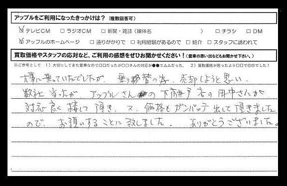 大事に乗っていた車でしたが、乗り換えの為、売却しようと思い、数社当ったがアップルさんの下高井戸の田中さんが対応良く接して頂き、又、価格もガンバッテ出して頂きましたので、お願いすることに致しました。ありがとうございました。