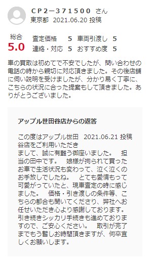 車の買取は初めてで不安でしたが、問い合わせの電話の時から親切に対応頂きました。その後店舗に伺い説明を受けましたが、分かり易く丁寧に、こちらの状況に合った提案もして頂きました。ありがとうございました。