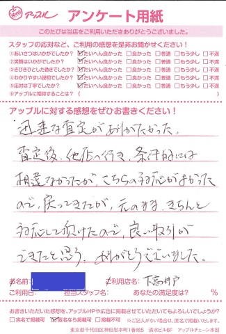 迅速な査定がありがたかった。査定直後、他店へ行き条件的には相違がなかったが、こちらの対応が良かったので戻ってきたが元のままきちんと対応して頂けたので良い取引が出来たとおもう。ありがとうございました。