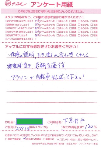 お車のご相談・ 査定だけでもOK! カンタン 入力 30秒 アップルがブランド買取始めました! お電話でも受付中! 受付時間10:00 ~ 19:00 0120-037-315 お車のご相談・ 査定だけでもOK! カンタン 入力 30秒 アップルがブランド買取始めました! お電話でも受付中! 受付時間10:00 ~ 19:00 0120-037-315 アップルがブランド買取始めました! お電話でも受付中! 受付時間10:00 ~ 19:00 0120-037-315 店舗情報 在庫車 スタッフ紹介 ブログ お客様の声 キャンペーン お得 無料査定 click お客様の声 ご記入日: 2014/03/24 世田谷区 K様 保険の説明、引き渡しの流れ等くわしく御説明頂き、感謝至極です。マラソン+自転車がんばって下さい! 前へ 次へ お客様の声一覧を見る