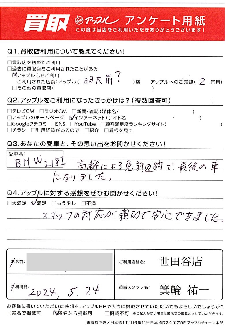 東京都杉並区 アンケート用紙より I様 車名:BMW 2シリーズグランクーペ